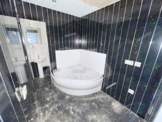 Bathroom - A three piece suite with corner Jacuzzi bath, pedestal hand basin, low level W.C, splash back tiling and panelling to walls.