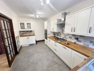 Kitchen - 4.45m x 2.56m (14'7" x 8'4") - Fitted with a range of wall and base units contrasting work surfaces, 1 1/2 stainless steel sink with drainer unit and mixer tap over, splash back tiling, integrated gas hob, double electric oven and extractor fan over, plumbed for dishwasher, coving, UPVc double glazed window to porch, door, towel rail and tiled flooring.