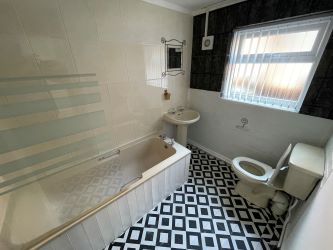 Bathroom - A white suite comprising: Panelled bath with electric shower over, pedestal hand basin, low level W.C, splash back tiling, UPVc double glazed frosted window to rear aspect, chrome ladder towel rail and vinyl flooring.